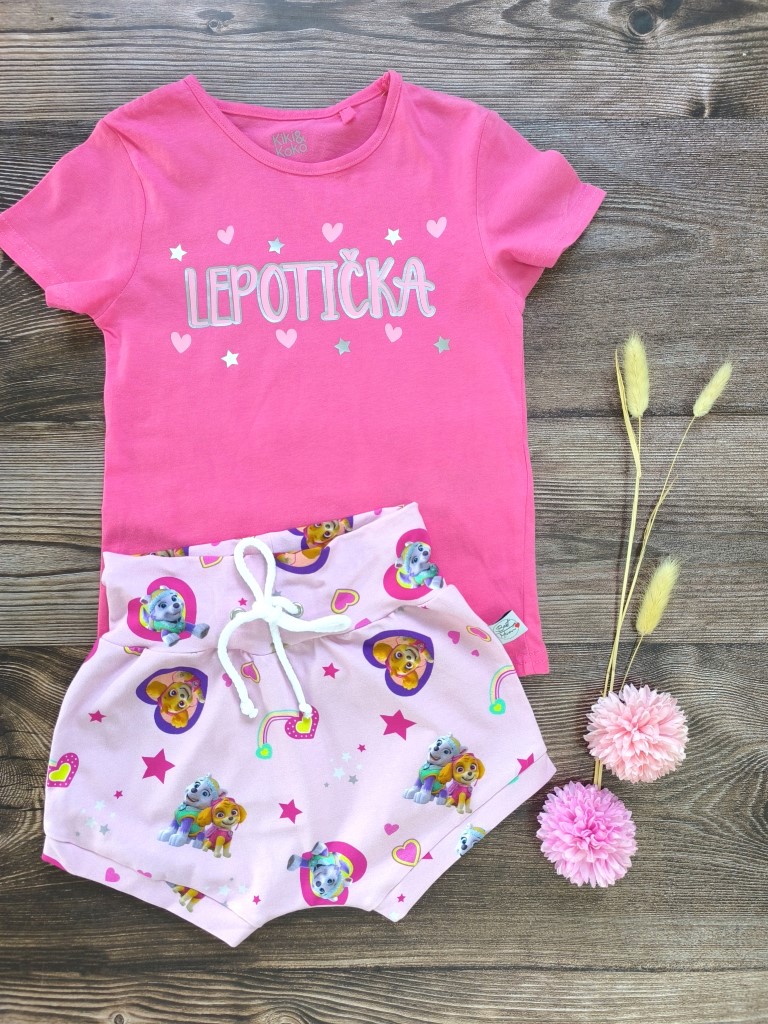 Kratke hlačke z regulacijo v pasu in majica.