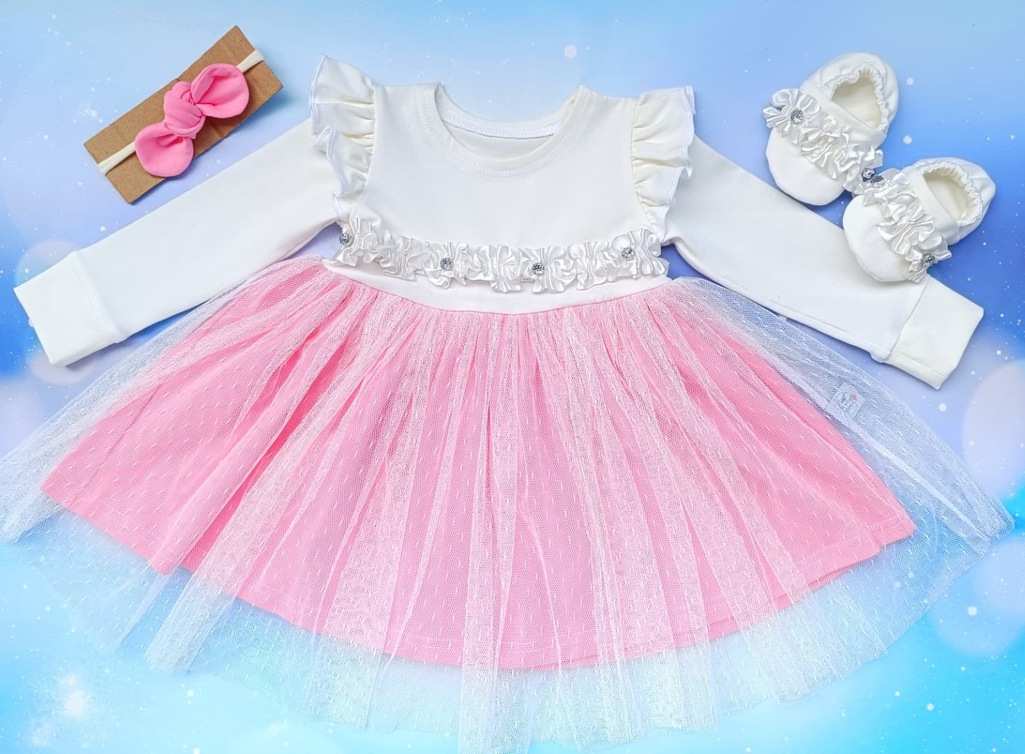 Oblekica s tilom, okrasni trakec za na glavo, copatki balerinke (6-9m)