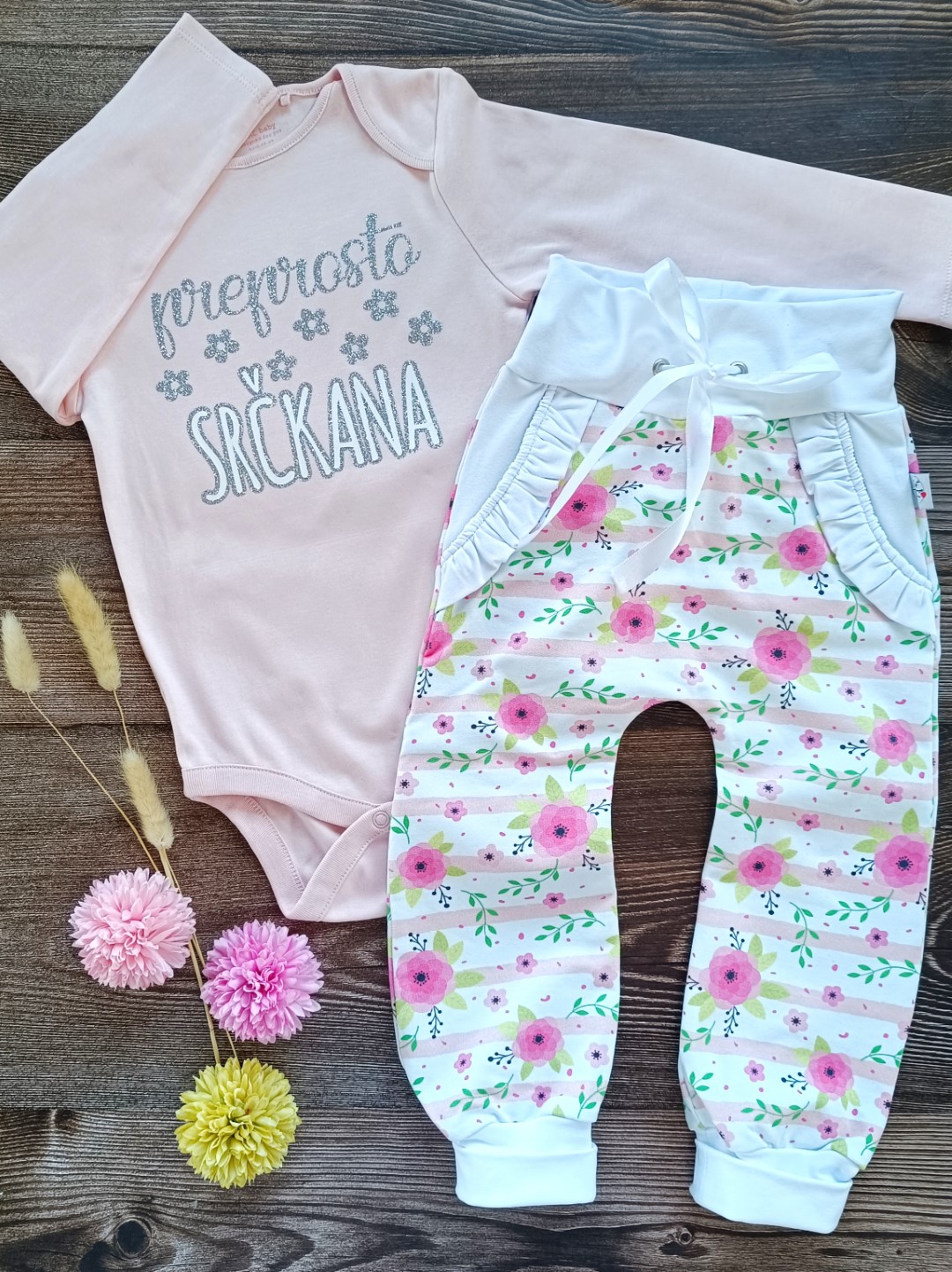 Kompletek vsebuje hlačke z regulacijo v pasu in body.